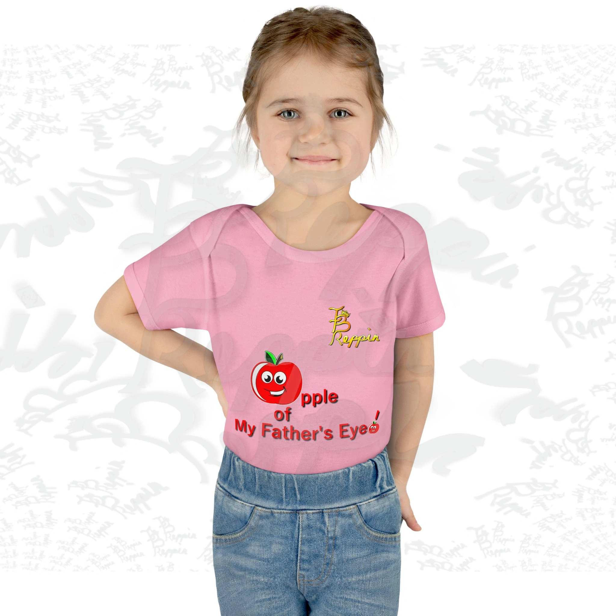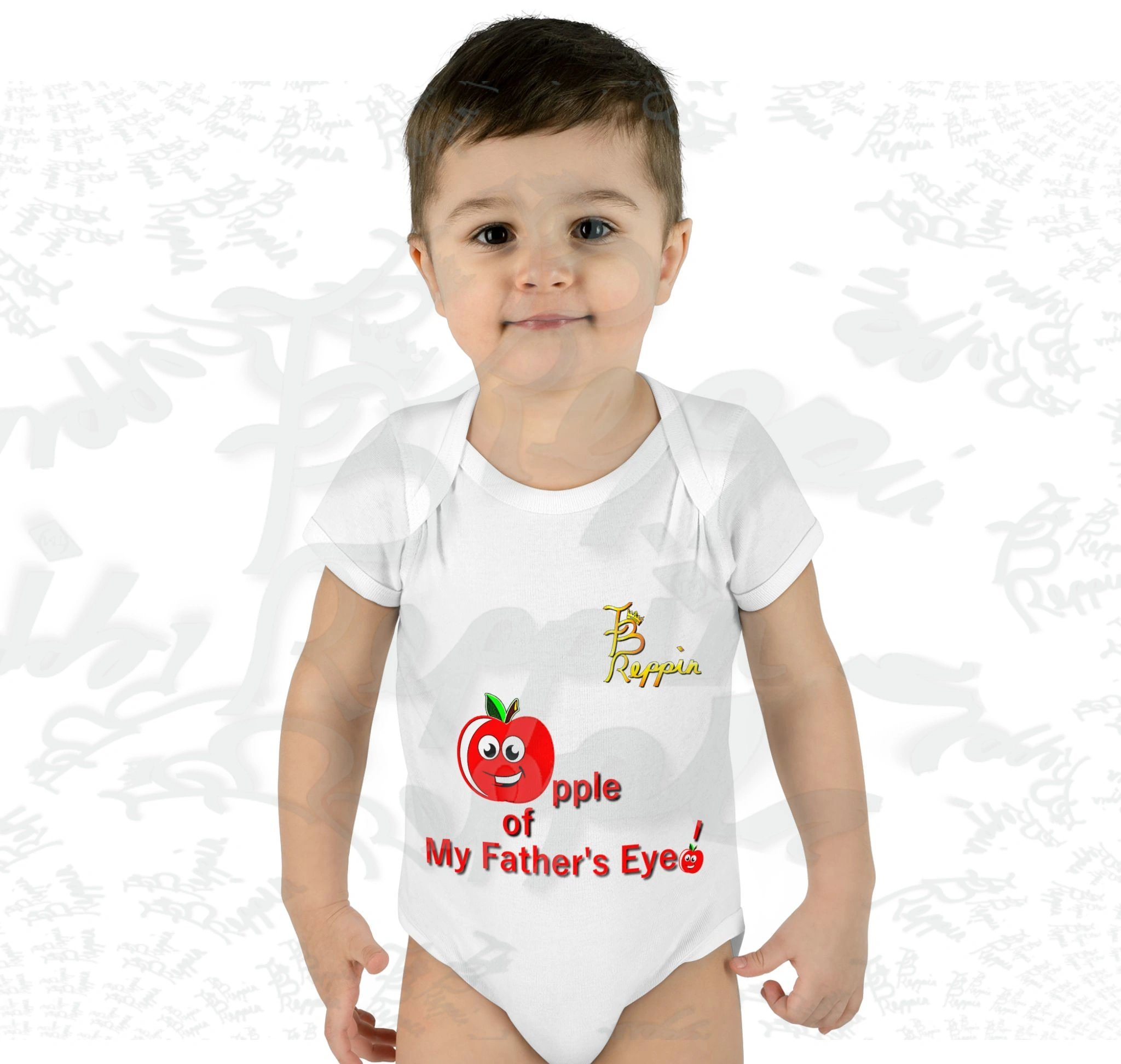 “Apple of My Father’s Eye Baby Onesie.“ This baby rib onesie is super soft and cute with lap shoulders. Made of 100% ring-spun cotton. Comes in white, blue and pink as available. You’re never too young to rep! Please allow “on average,” 7 to 10 business days for item production and arrival.