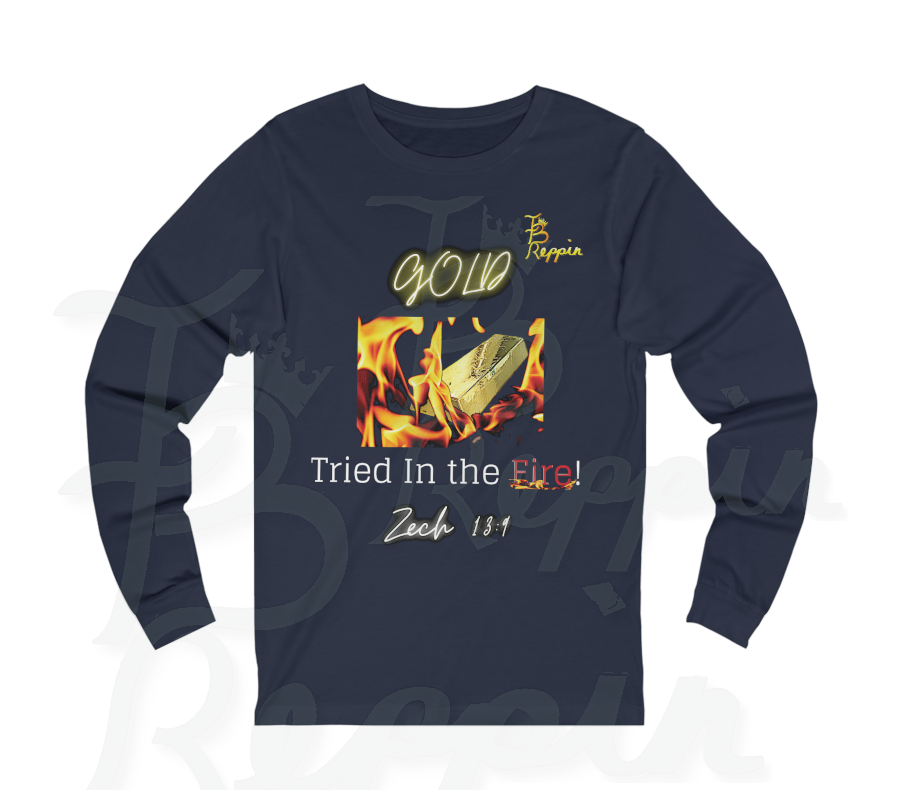 “Gold Tried In The Fire Long Sleeve T-shirt.” This ultra 100% cotton long sleeve tee is a clear comfort winner! Comes in navy and black as available. Order now & start reppin! Please allow “on average” 7 to 10 business days for item production and arrival.